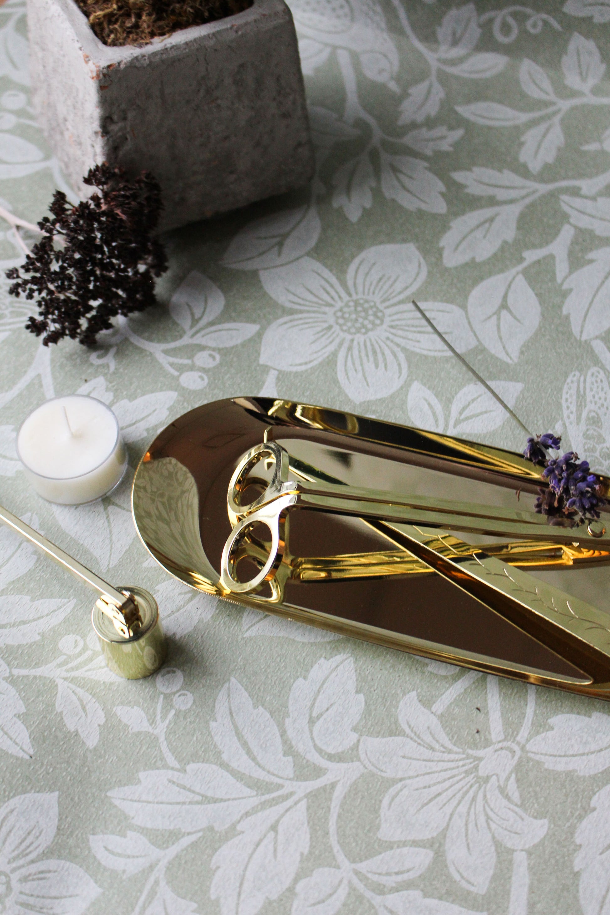 The set includes a wick trimmer, wick dipper, snuffer, and a matching tray — everything you need to ensure a clean, even burn and extend the life of your favorite candles.