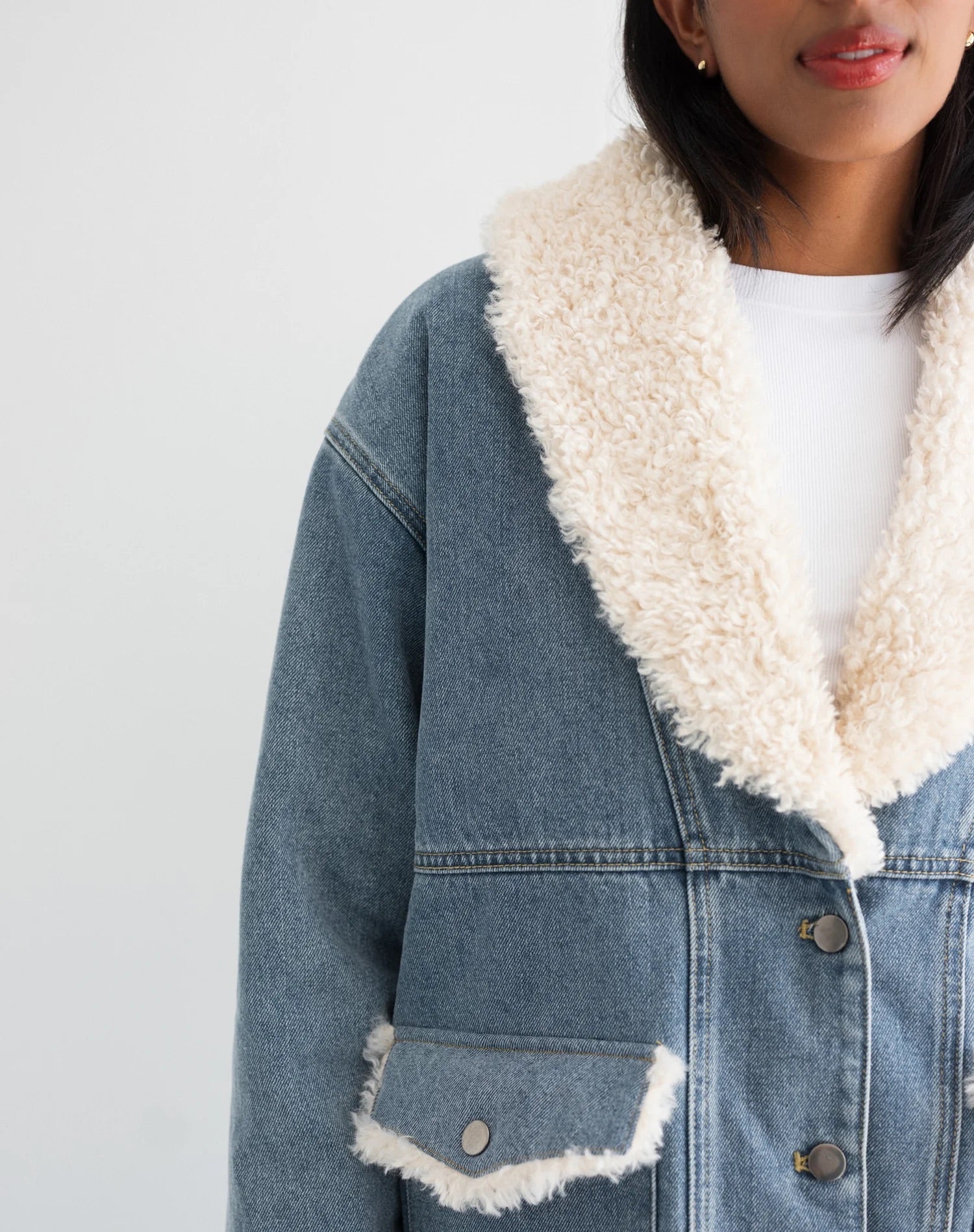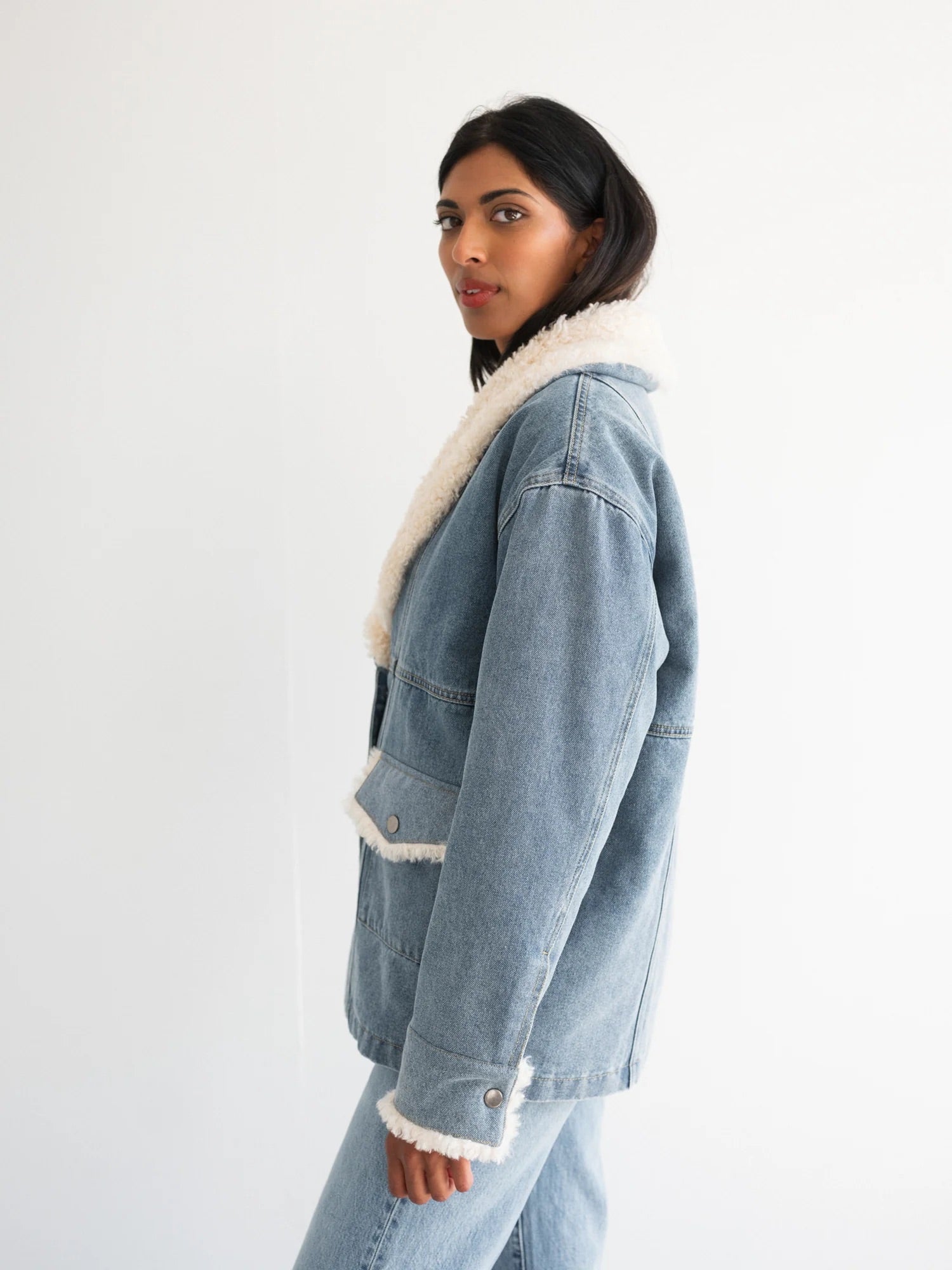 The Farrah Jacket features a denim base, soft sherpa details, and a quilted lining for extra warmth. Snap button closures make it easy to wear, and flipping the cuffs adds a little extra style. True to size, so go up one for an oversized, relaxed fit.