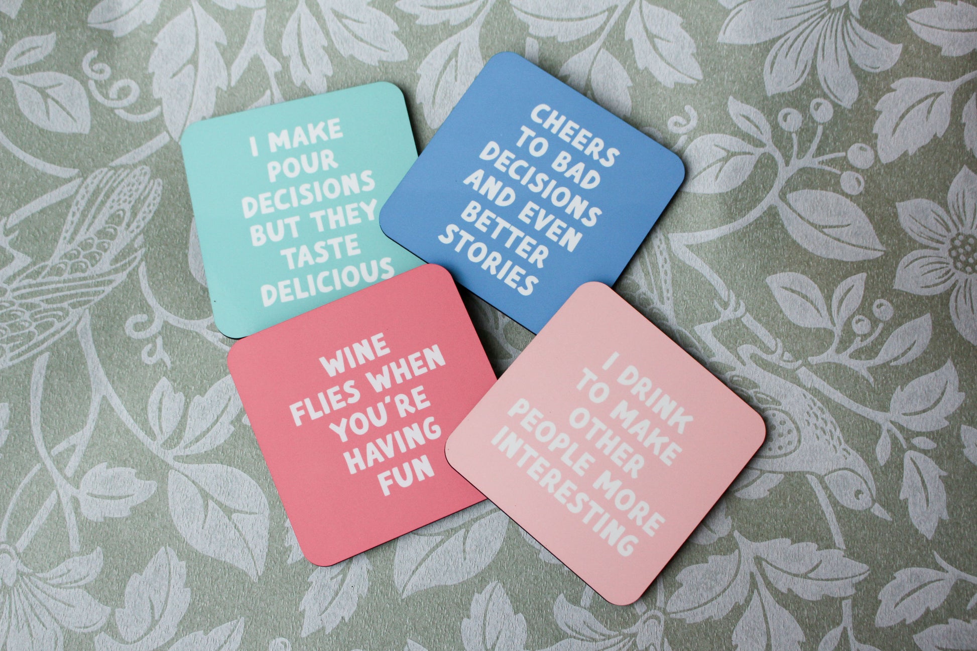 Add a pop of color (and a good laugh) to your table with our Sip & Say Coasters. Each coaster features a witty, drink-inspired saying printed in bold white text on a pastel background — the perfect mix of playful and practical.