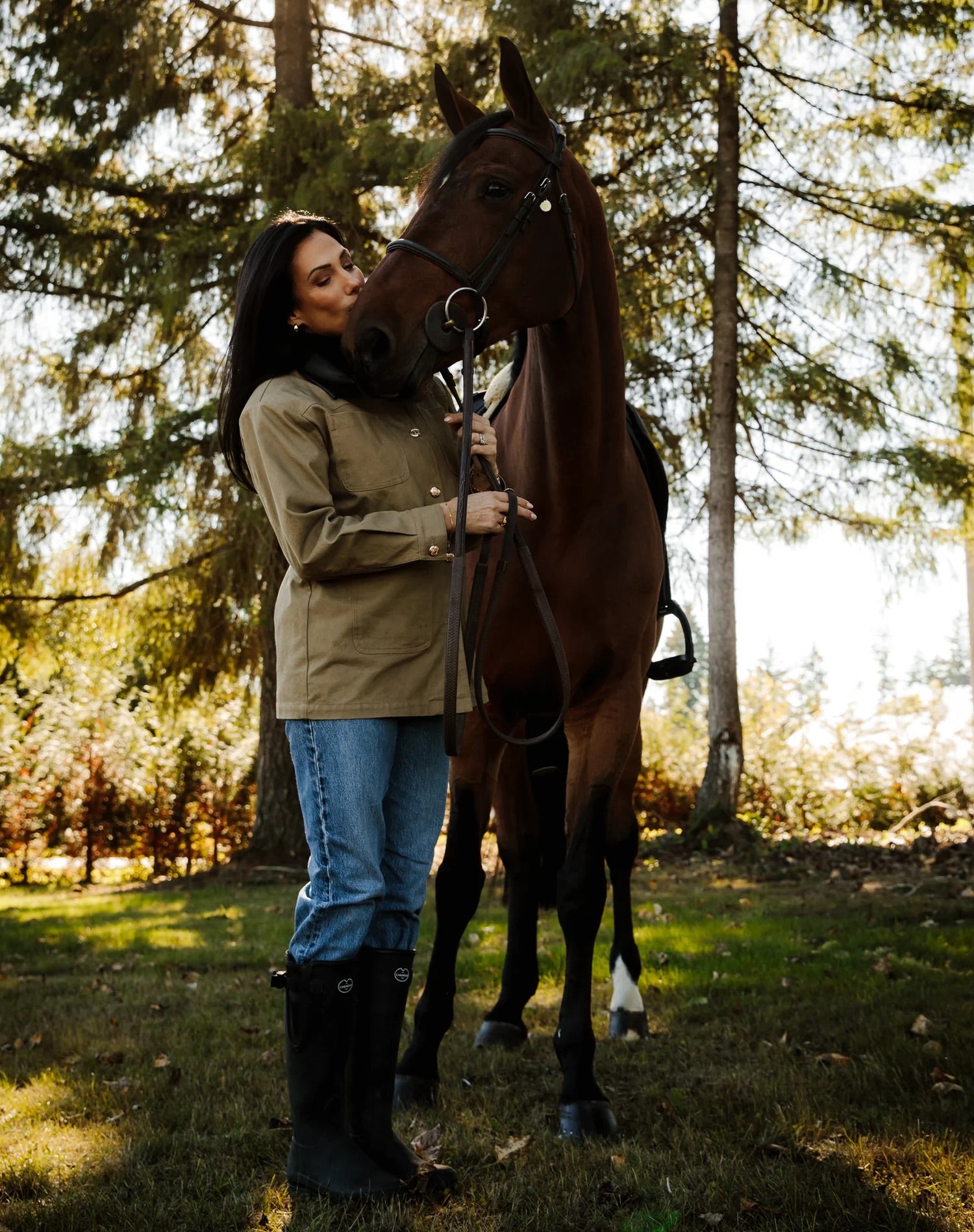 The Barn Coat is crafted from 100% cotton canvas with gold metallic crest buttons and a vegan leather collar. Designed with a relaxed, tailored fit and structured shoulders, it’s the perfect mix of polished and lived-in. Finished with patch pockets and cuff details that make it just as good rolled up as it is buttoned down. She’ll take you straight from the barn to cocktails at your favourite hotel bar.